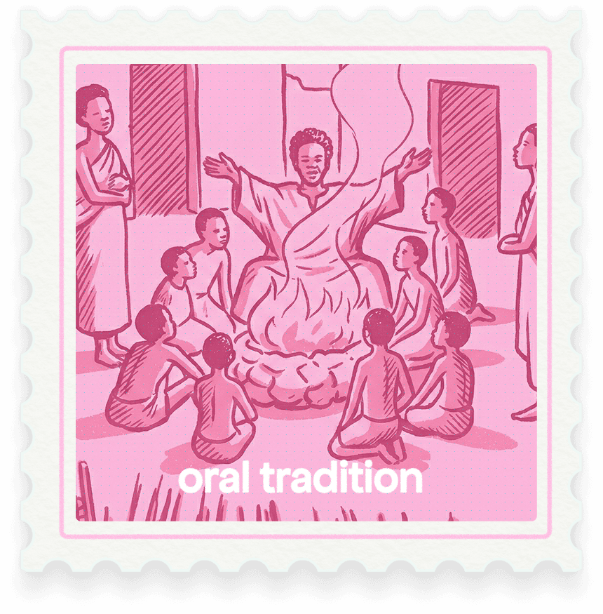 The primal baseline. Before screens, knowledge lived in the rhythm of the spoken word, relying on memory and real-time social feedback to survive.